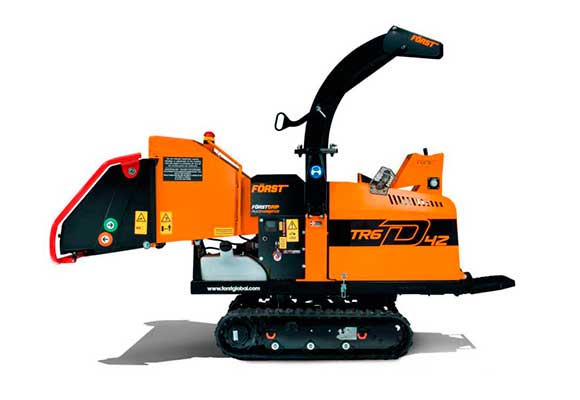 Houtversnipperaar op rupsen met hoge rijsnelheid en afneembare trechter.